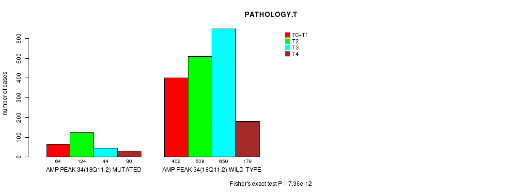 2 subtypes identified in current cancer cohort by 'Amp Peak 34(18q11.2) mutation analysis'. These subtypes correlate to 'PRIMARY.SITE.OF.DISEASE', 'HISTOLOGICAL.TYPE', and 'PATHOLOGY.T'.