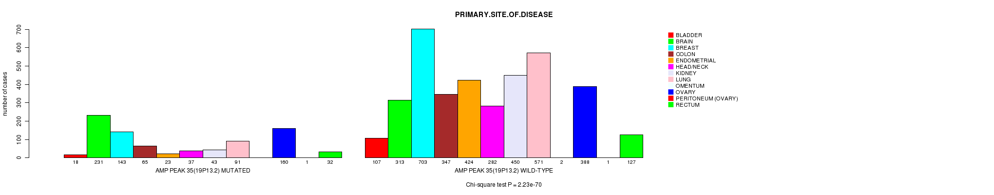 2 subtypes identified in current cancer cohort by 'Amp Peak 35(19p13.2) mutation analysis'. These subtypes correlate to 'Time to Death', 'PRIMARY.SITE.OF.DISEASE', 'HISTOLOGICAL.TYPE', 'TUMOR.STAGE', and 'RADIATIONS.RADIATION.REGIMENINDICATION'.