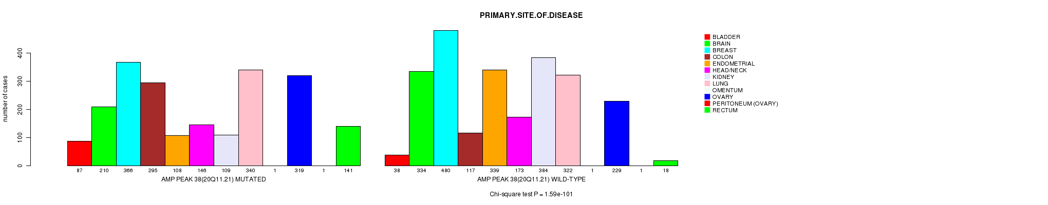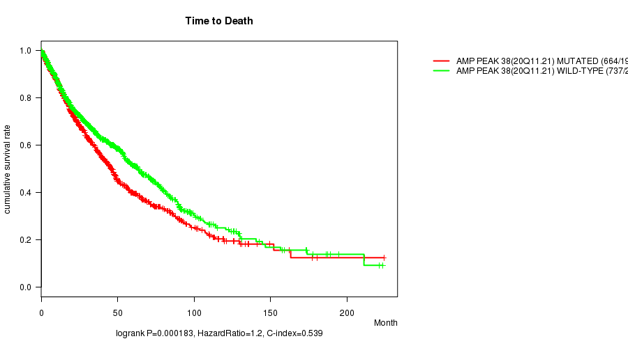 2 subtypes identified in current cancer cohort by 'Amp Peak 38(20q11.21) mutation analysis'. These subtypes correlate to 'Time to Death', 'AGE', 'PRIMARY.SITE.OF.DISEASE', 'GENDER', 'HISTOLOGICAL.TYPE', 'PATHOLOGY.T', 'PATHOLOGY.N', 'TUMOR.STAGE', and 'RADIATIONS.RADIATION.REGIMENINDICATION'.