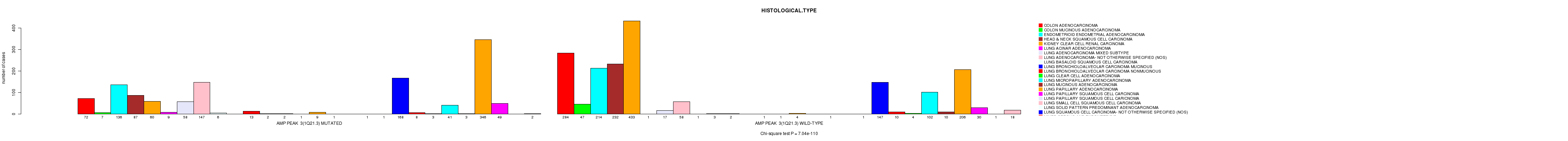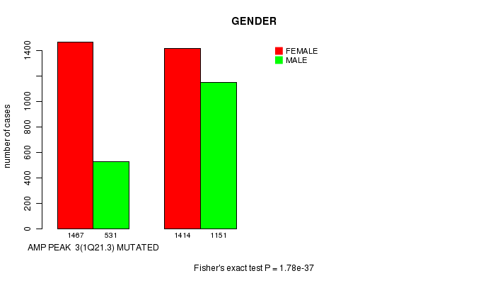 2 subtypes identified in current cancer cohort by 'Amp Peak 3(1q21.3) mutation analysis'. These subtypes correlate to 'Time to Death', 'PRIMARY.SITE.OF.DISEASE', 'GENDER', 'HISTOLOGICAL.TYPE', 'PATHOLOGY.T', 'PATHOLOGICSPREAD(M)', and 'TUMOR.STAGE'.