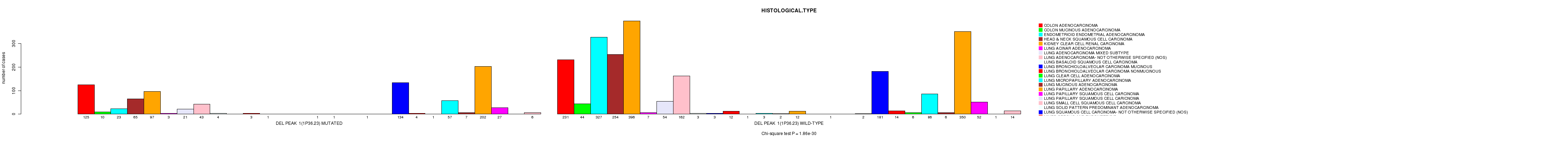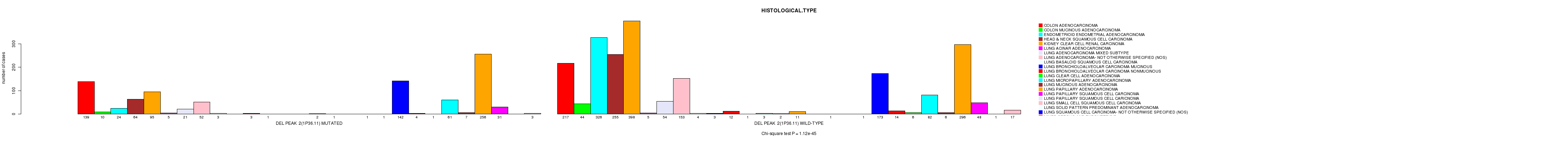 2 subtypes identified in current cancer cohort by 'Del Peak 1(1p36.23) mutation analysis'. These subtypes correlate to 'PRIMARY.SITE.OF.DISEASE', 'HISTOLOGICAL.TYPE', and 'NEOPLASM.DISEASESTAGE'.
