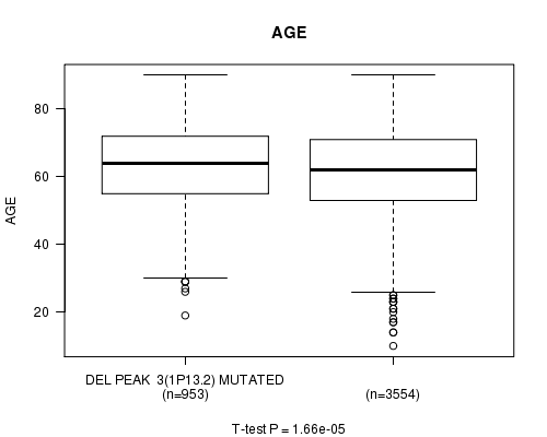 2 subtypes identified in current cancer cohort by 'Del Peak 3(1p13.2) mutation analysis'. These subtypes correlate to 'AGE', 'PRIMARY.SITE.OF.DISEASE', 'HISTOLOGICAL.TYPE', 'RADIATIONS.RADIATION.REGIMENINDICATION', 'TOBACCOSMOKINGHISTORYINDICATOR', and 'NUMBER.OF.LYMPH.NODES'.