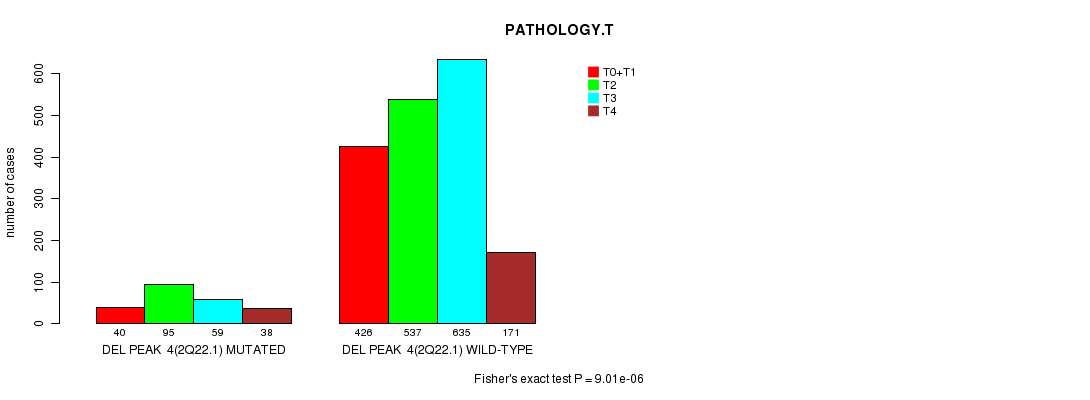 2 subtypes identified in current cancer cohort by 'Del Peak 4(2q22.1) mutation analysis'. These subtypes correlate to 'PRIMARY.SITE.OF.DISEASE', 'HISTOLOGICAL.TYPE', 'PATHOLOGY.T', and 'TUMOR.STAGE'.