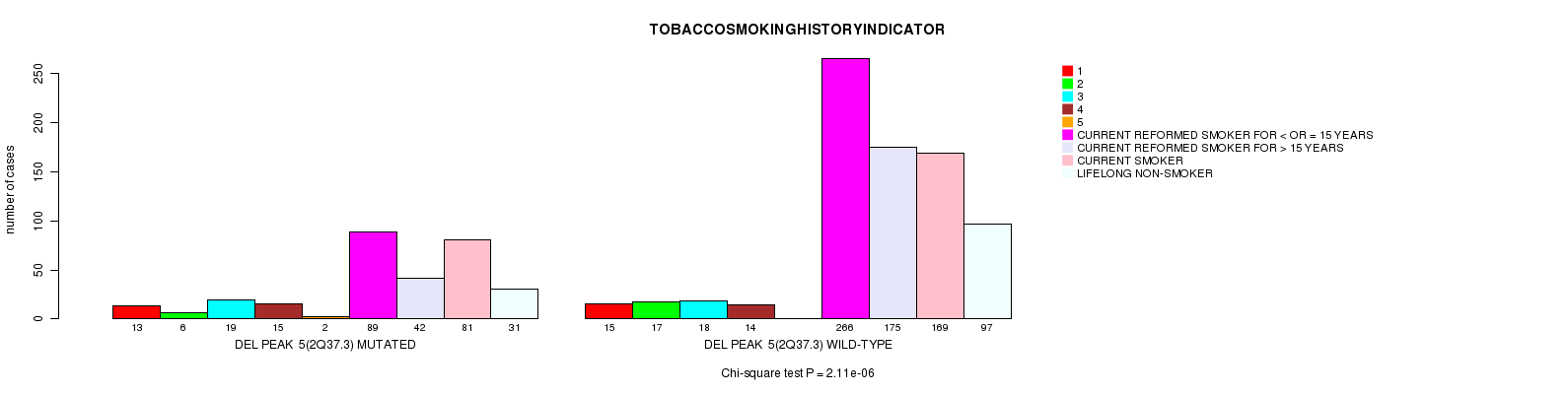 2 subtypes identified in current cancer cohort by 'Del Peak 5(2q37.3) mutation analysis'. These subtypes correlate to 'PRIMARY.SITE.OF.DISEASE', 'HISTOLOGICAL.TYPE', and 'TOBACCOSMOKINGHISTORYINDICATOR'.
