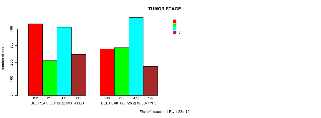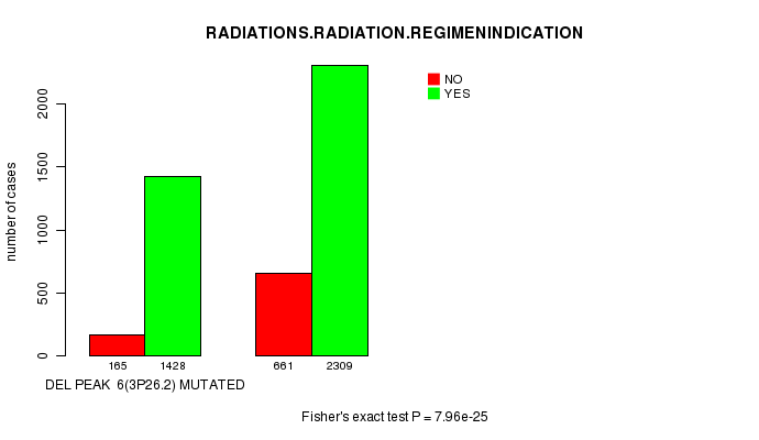 2 subtypes identified in current cancer cohort by 'Del Peak 6(3p26.2) mutation analysis'. These subtypes correlate to 'PRIMARY.SITE.OF.DISEASE', 'GENDER', 'HISTOLOGICAL.TYPE', 'PATHOLOGY.T', 'TUMOR.STAGE', 'RADIATIONS.RADIATION.REGIMENINDICATION', and 'TOBACCOSMOKINGHISTORYINDICATOR'.