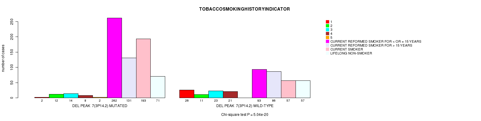 2 subtypes identified in current cancer cohort by 'Del Peak 7(3p14.2) mutation analysis'. These subtypes correlate to 'PRIMARY.SITE.OF.DISEASE', 'GENDER', 'KARNOFSKY.PERFORMANCE.SCORE', 'HISTOLOGICAL.TYPE', 'PATHOLOGY.T', 'TUMOR.STAGE', 'RADIATIONS.RADIATION.REGIMENINDICATION', and 'TOBACCOSMOKINGHISTORYINDICATOR'.