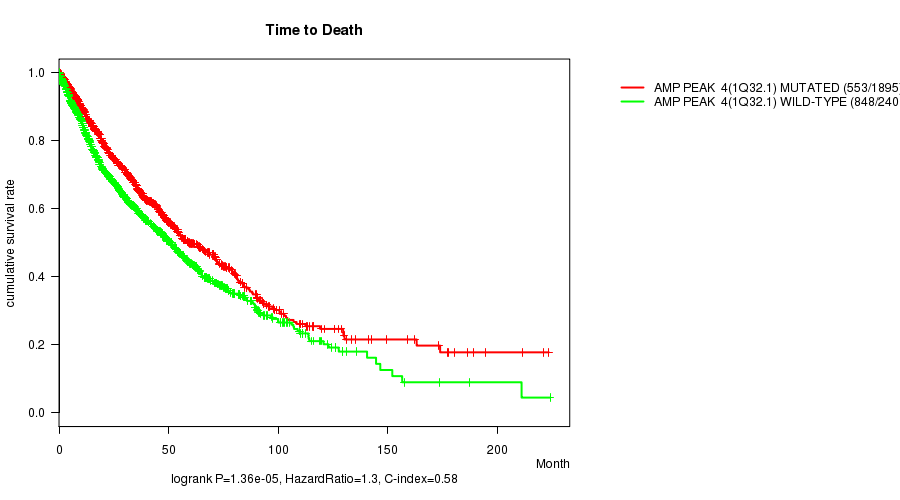 2 subtypes identified in current cancer cohort by 'Amp Peak 4(1q32.1) mutation analysis'. These subtypes correlate to 'Time to Death', 'PRIMARY.SITE.OF.DISEASE', 'GENDER', 'HISTOLOGICAL.TYPE', 'PATHOLOGY.T', 'PATHOLOGICSPREAD(M)', 'TOBACCOSMOKINGHISTORYINDICATOR', and 'NEOPLASM.DISEASESTAGE'.