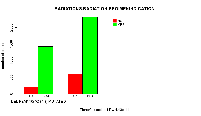 2 subtypes identified in current cancer cohort by 'Del Peak 10(4q34.3) mutation analysis'. These subtypes correlate to 'PRIMARY.SITE.OF.DISEASE', 'HISTOLOGICAL.TYPE', 'PATHOLOGY.T', 'TUMOR.STAGE', and 'RADIATIONS.RADIATION.REGIMENINDICATION'.