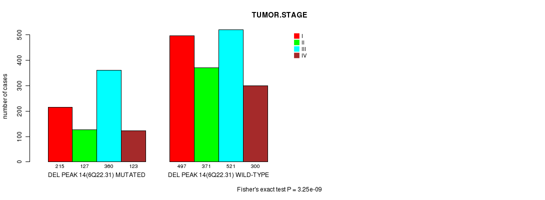2 subtypes identified in current cancer cohort by 'Del Peak 14(6q22.31) mutation analysis'. These subtypes correlate to 'PRIMARY.SITE.OF.DISEASE', 'HISTOLOGICAL.TYPE', 'PATHOLOGY.T', and 'TUMOR.STAGE'.