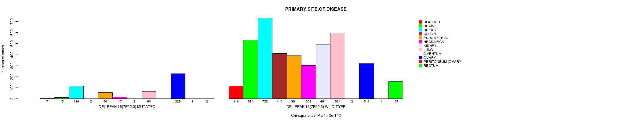 2 subtypes identified in current cancer cohort by 'Del Peak 16(7p22.3) mutation analysis'. These subtypes correlate to 'PRIMARY.SITE.OF.DISEASE', 'GENDER', 'HISTOLOGICAL.TYPE', 'PATHOLOGY.T', and 'TUMOR.STAGE'.