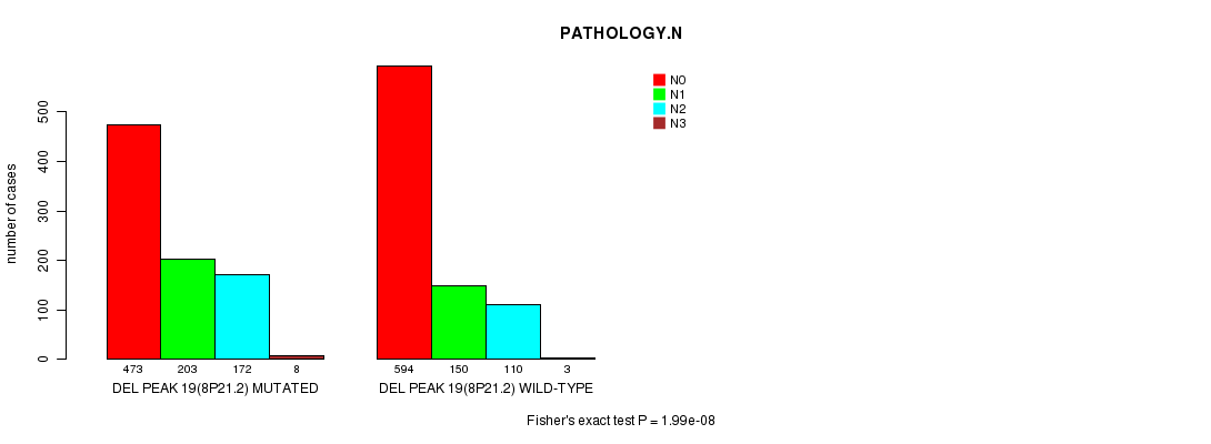 2 subtypes identified in current cancer cohort by 'Del Peak 19(8p21.2) mutation analysis'. These subtypes correlate to 'PRIMARY.SITE.OF.DISEASE', 'KARNOFSKY.PERFORMANCE.SCORE', 'HISTOLOGICAL.TYPE', 'PATHOLOGY.N', 'TUMOR.STAGE', and 'RADIATIONS.RADIATION.REGIMENINDICATION'.
