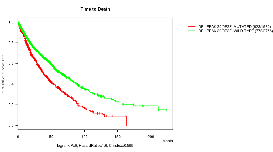 2 subtypes identified in current cancer cohort by 'Del Peak 20(9p23) mutation analysis'. These subtypes correlate to 'Time to Death', 'PRIMARY.SITE.OF.DISEASE', 'GENDER', 'HISTOLOGICAL.TYPE', and 'PATHOLOGY.T'.