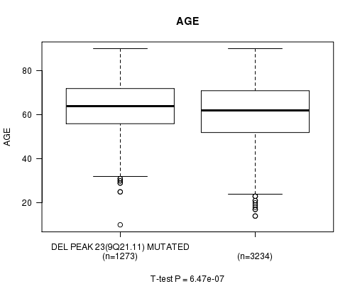 2 subtypes identified in current cancer cohort by 'Del Peak 23(9q21.11) mutation analysis'. These subtypes correlate to 'AGE', 'PRIMARY.SITE.OF.DISEASE', 'HISTOLOGICAL.TYPE', 'PATHOLOGY.T', 'TUMOR.STAGE', and 'RADIATIONS.RADIATION.REGIMENINDICATION'.