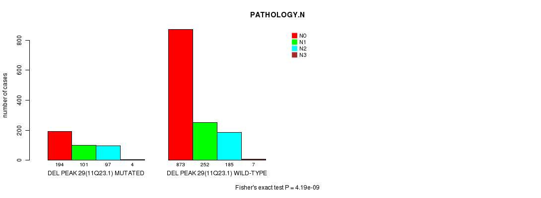 2 subtypes identified in current cancer cohort by 'Del Peak 29(11q23.1) mutation analysis'. These subtypes correlate to 'PRIMARY.SITE.OF.DISEASE', 'GENDER', 'HISTOLOGICAL.TYPE', 'PATHOLOGY.T', 'PATHOLOGY.N', and 'TUMOR.STAGE'.