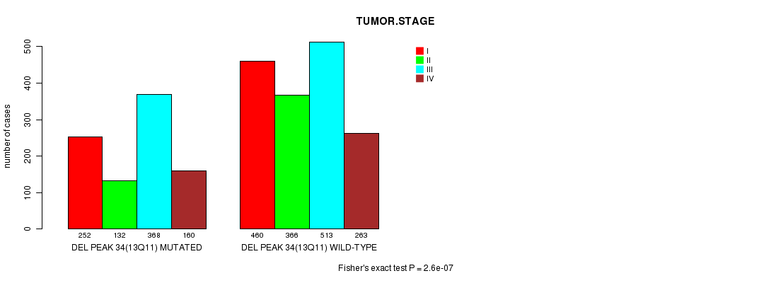 2 subtypes identified in current cancer cohort by 'Del Peak 34(13q11) mutation analysis'. These subtypes correlate to 'PRIMARY.SITE.OF.DISEASE', 'HISTOLOGICAL.TYPE', 'PATHOLOGY.T', 'PATHOLOGICSPREAD(M)', 'TUMOR.STAGE', and 'TOBACCOSMOKINGHISTORYINDICATOR'.