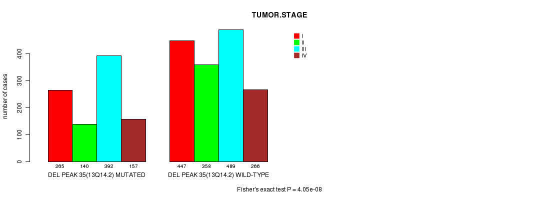 2 subtypes identified in current cancer cohort by 'Del Peak 35(13q14.2) mutation analysis'. These subtypes correlate to 'Time to Death', 'PRIMARY.SITE.OF.DISEASE', 'HISTOLOGICAL.TYPE', 'PATHOLOGY.T', 'PATHOLOGICSPREAD(M)', 'TUMOR.STAGE', and 'TOBACCOSMOKINGHISTORYINDICATOR'.