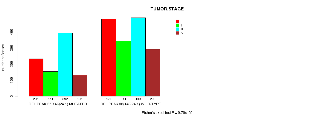 2 subtypes identified in current cancer cohort by 'Del Peak 36(14q24.1) mutation analysis'. These subtypes correlate to 'PRIMARY.SITE.OF.DISEASE', 'HISTOLOGICAL.TYPE', 'PATHOLOGY.T', 'PATHOLOGY.N', and 'TUMOR.STAGE'.