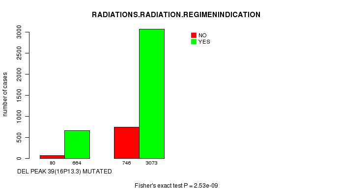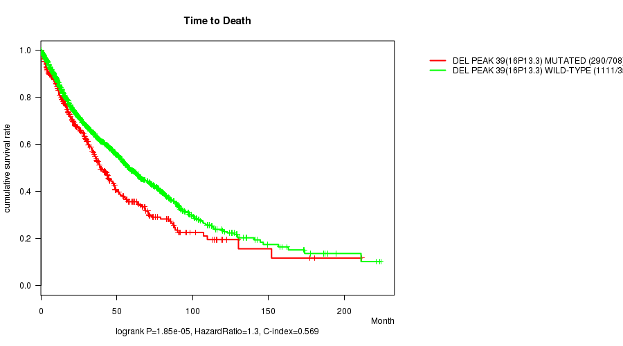 2 subtypes identified in current cancer cohort by 'Del Peak 39(16p13.3) mutation analysis'. These subtypes correlate to 'Time to Death', 'PRIMARY.SITE.OF.DISEASE', 'HISTOLOGICAL.TYPE', 'TUMOR.STAGE', 'RADIATIONS.RADIATION.REGIMENINDICATION', and 'NEOPLASM.DISEASESTAGE'.