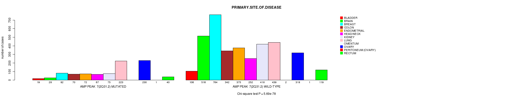 2 subtypes identified in current cancer cohort by 'Del Peak 17(7q36.1) mutation analysis'. These subtypes correlate to 'PRIMARY.SITE.OF.DISEASE', 'HISTOLOGICAL.TYPE', and 'PATHOLOGY.T'.