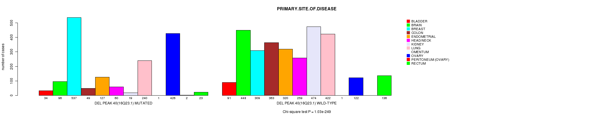 2 subtypes identified in current cancer cohort by 'Del Peak 40(16q23.1) mutation analysis'. These subtypes correlate to 'PRIMARY.SITE.OF.DISEASE', 'GENDER', 'HISTOLOGICAL.TYPE', 'PATHOLOGY.T', 'TUMOR.STAGE', 'RADIATIONS.RADIATION.REGIMENINDICATION', and 'NEOPLASM.DISEASESTAGE'.