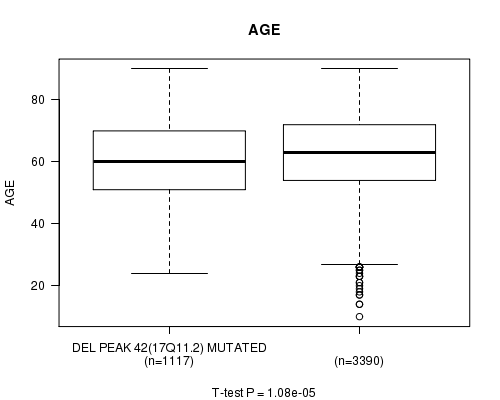 2 subtypes identified in current cancer cohort by 'Del Peak 42(17q11.2) mutation analysis'. These subtypes correlate to 'AGE', 'PRIMARY.SITE.OF.DISEASE', 'GENDER', 'HISTOLOGICAL.TYPE', 'TUMOR.STAGE', and 'RADIATIONS.RADIATION.REGIMENINDICATION'.