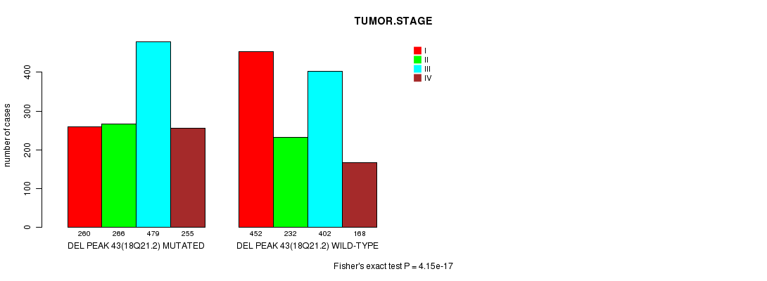 2 subtypes identified in current cancer cohort by 'Del Peak 43(18q21.2) mutation analysis'. These subtypes correlate to 'AGE', 'PRIMARY.SITE.OF.DISEASE', 'HISTOLOGICAL.TYPE', 'PATHOLOGY.T', 'PATHOLOGY.N', 'PATHOLOGICSPREAD(M)', 'TUMOR.STAGE', and 'RADIATIONS.RADIATION.REGIMENINDICATION'.