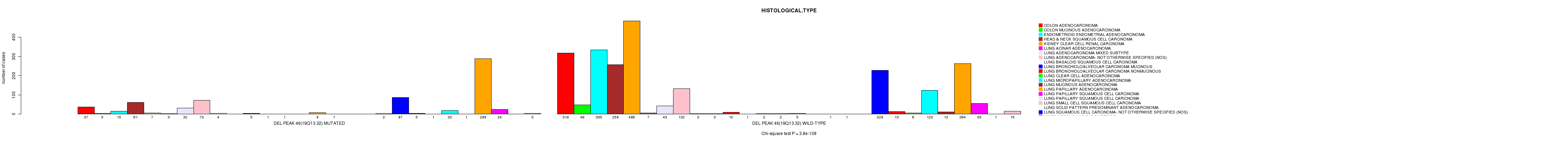 2 subtypes identified in current cancer cohort by 'Del Peak 46(19q13.32) mutation analysis'. These subtypes correlate to 'PRIMARY.SITE.OF.DISEASE', 'GENDER', 'HISTOLOGICAL.TYPE', 'PATHOLOGY.T', and 'TUMOR.STAGE'.