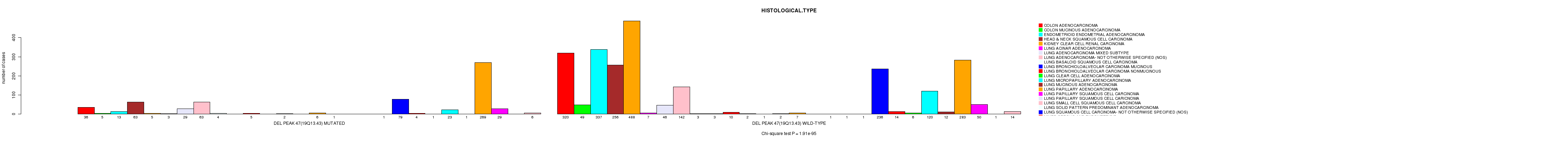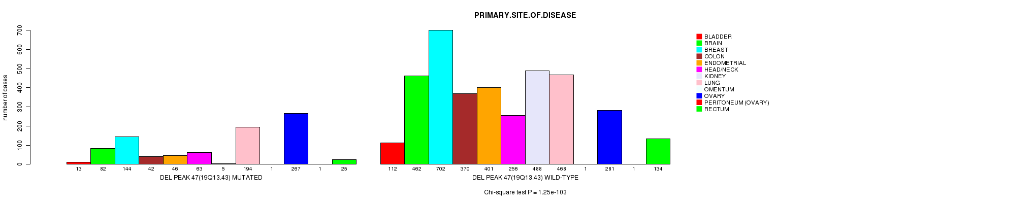 2 subtypes identified in current cancer cohort by 'Del Peak 47(19q13.43) mutation analysis'. These subtypes correlate to 'PRIMARY.SITE.OF.DISEASE', 'GENDER', 'HISTOLOGICAL.TYPE', 'PATHOLOGY.T', and 'TUMOR.STAGE'.