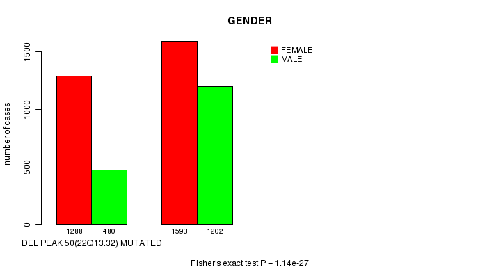 Figure S519. Get High-res Image Clustering Approach #90: 'Del Peak 50(22q13.32) mutation analysis' versus Clinical Feature #4: 'GENDER'