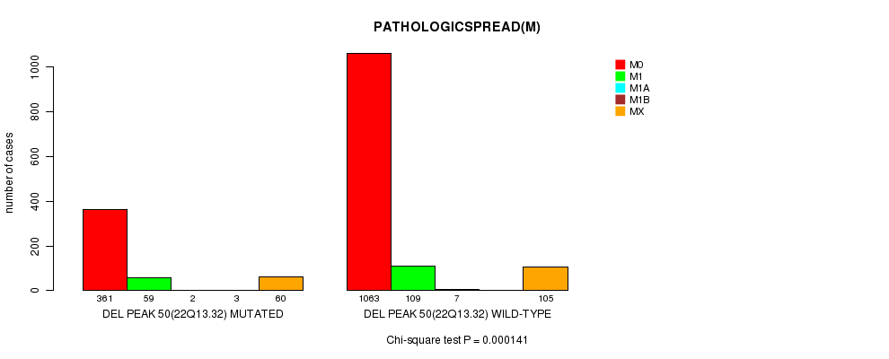 Figure S521. Get High-res Image Clustering Approach #90: 'Del Peak 50(22q13.32) mutation analysis' versus Clinical Feature #9: 'PATHOLOGICSPREAD(M)'