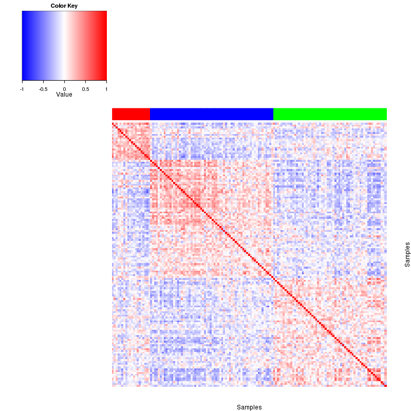 Figure 4. The consensus matrix after clustering shows 3 robust clusters with limited overlap between clusters.