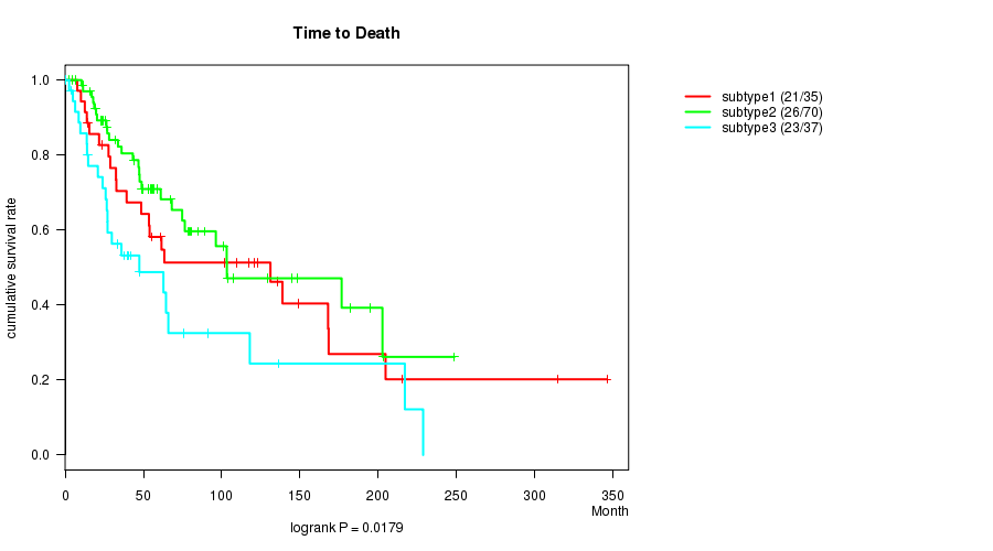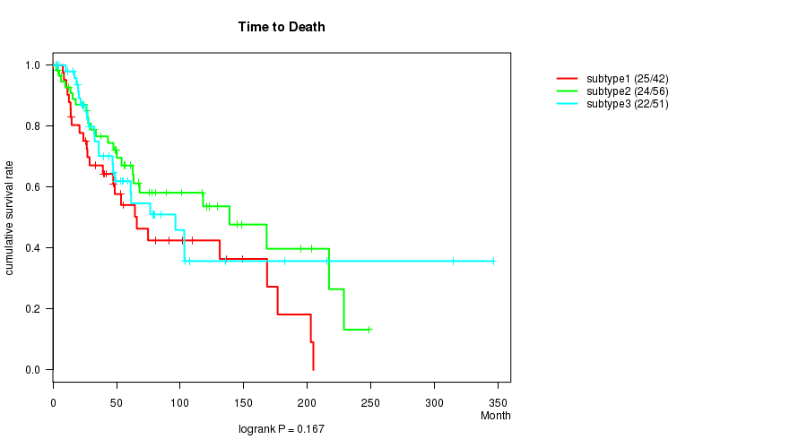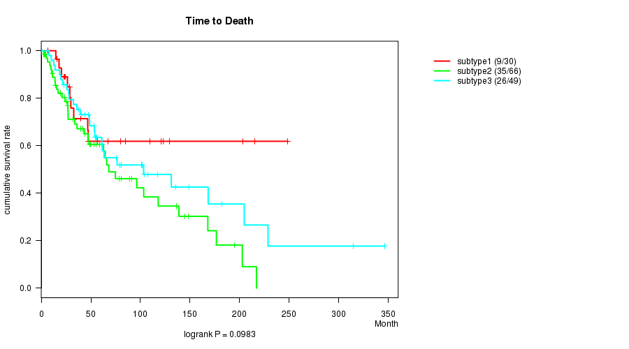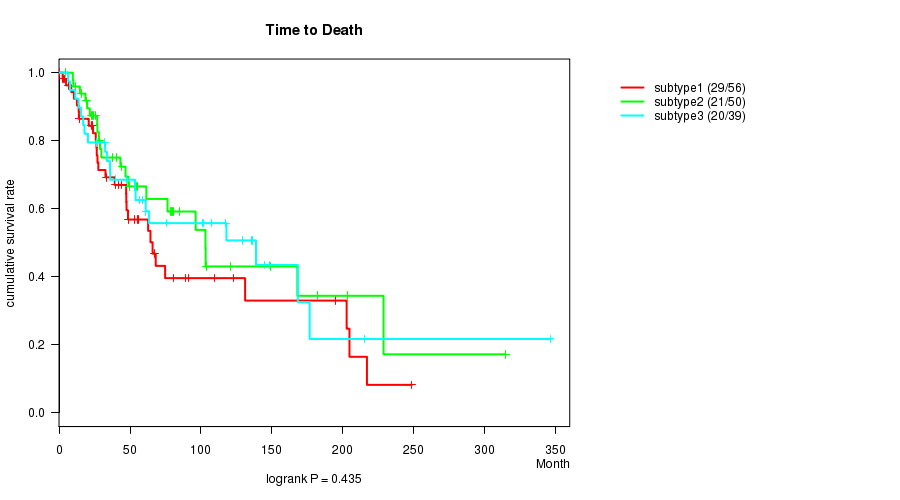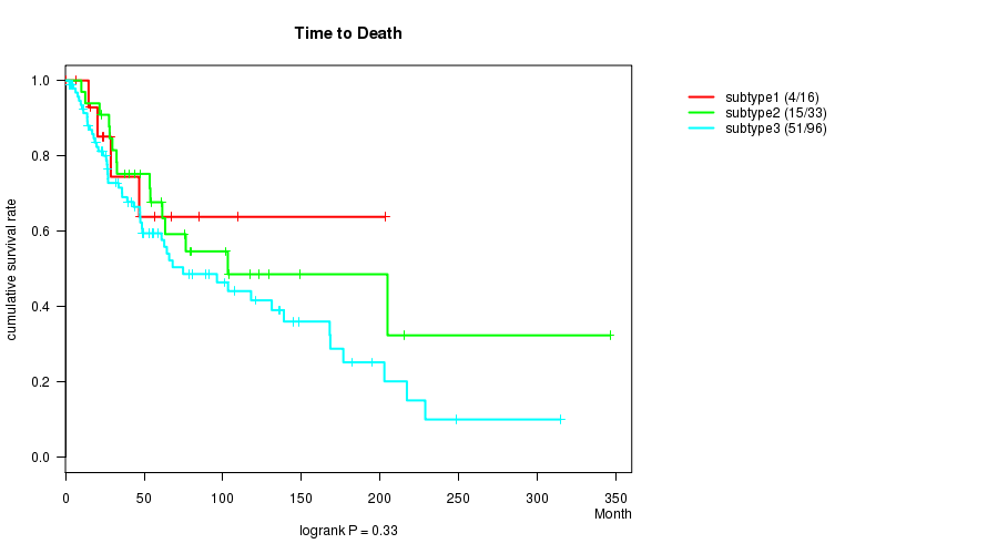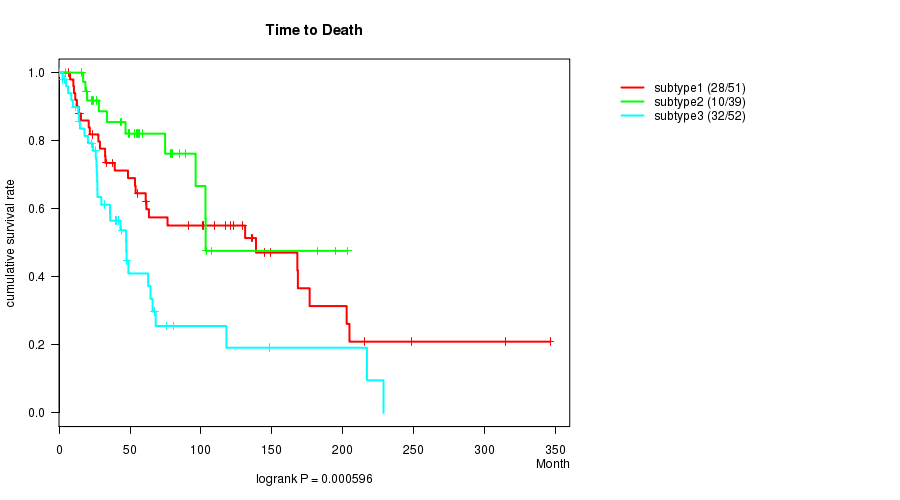 CNMF clustering analysis on sequencing-based mRNA expression data identified 3 subtypes that correlate to 'Time to Death'.