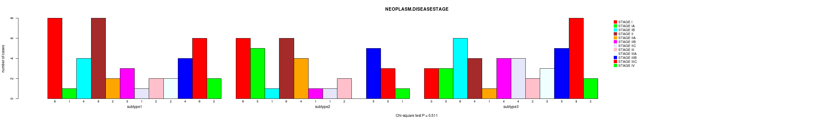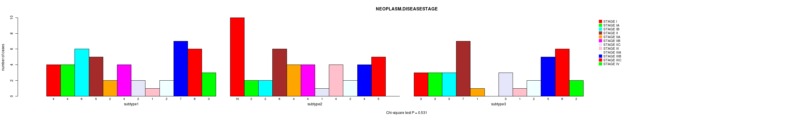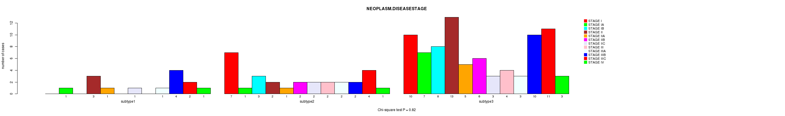 Figure S36. Get High-res Image Clustering Approach #6: 'RNAseq cHierClus subtypes' versus Clinical Feature #7: 'NEOPLASM.DISEASESTAGE'