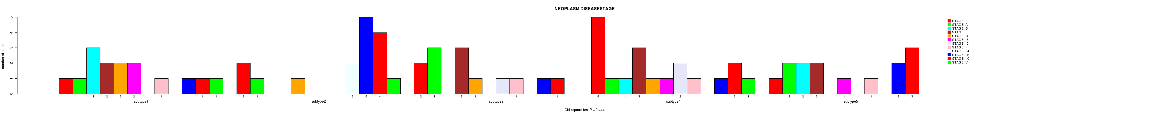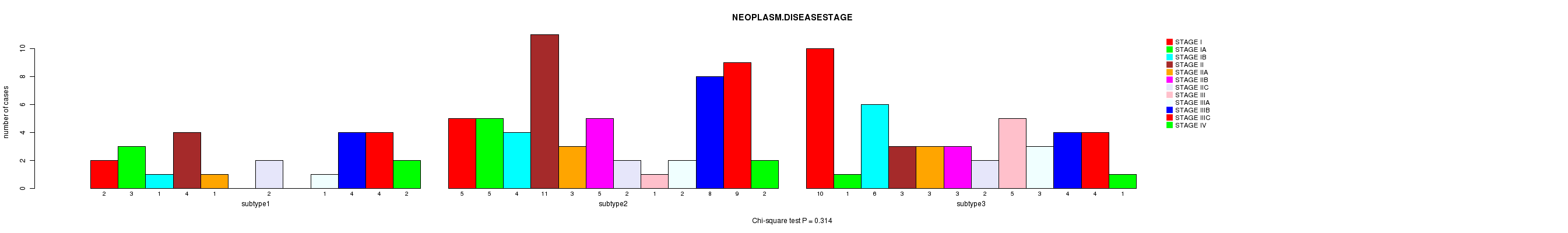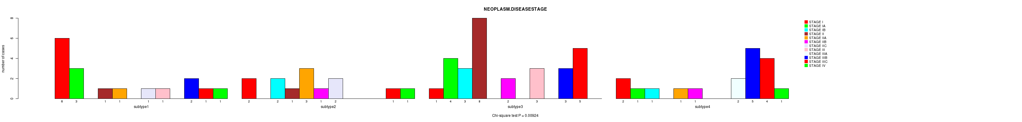 Figure S36. Get High-res Image Clustering Approach #6: 'RNAseq cHierClus subtypes' versus Clinical Feature #7: 'NEOPLASM.DISEASESTAGE'