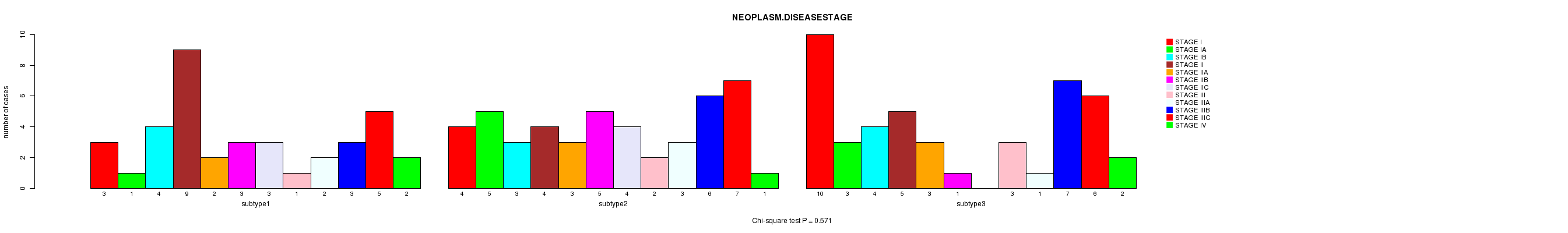 Figure S42. Get High-res Image Clustering Approach #7: 'MIRSEQ CNMF' versus Clinical Feature #7: 'NEOPLASM.DISEASESTAGE'