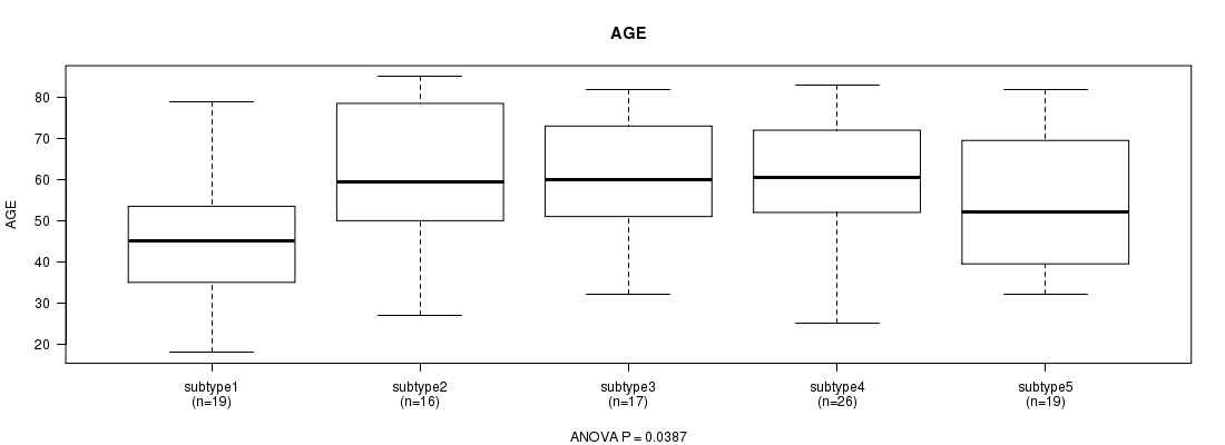 Figure S38. Get High-res Image Clustering Approach #7: 'MIRSEQ CNMF' versus Clinical Feature #2: 'AGE'