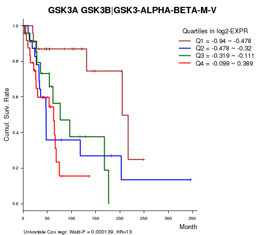 Figure S1. Get High-res Image As an example, this figure shows the association of GSK3A GSK3B|GSK3-ALPHA-BETA-M-V to 'Time to Death'. four curves present the cumulative survival rates of 4 quartile subsets of patients. P value = 0.000139 with univariate Cox regression analysis using continuous log-2 expression values.