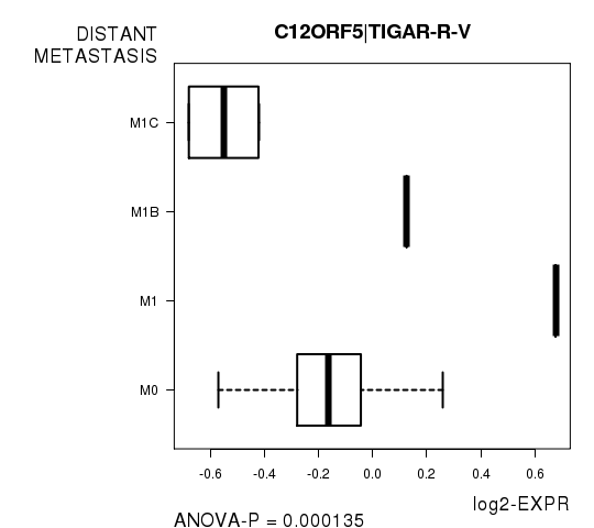 Figure S2. Get High-res Image As an example, this figure shows the association of C12ORF5|TIGAR-R-V to 'DISTANT.METASTASIS'. P value = 0.000135 with ANOVA analysis.