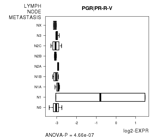 Figure S3. Get High-res Image As an example, this figure shows the association of PGR|PR-R-V to 'LYMPH.NODE.METASTASIS'. P value = 4.66e-07 with ANOVA analysis.