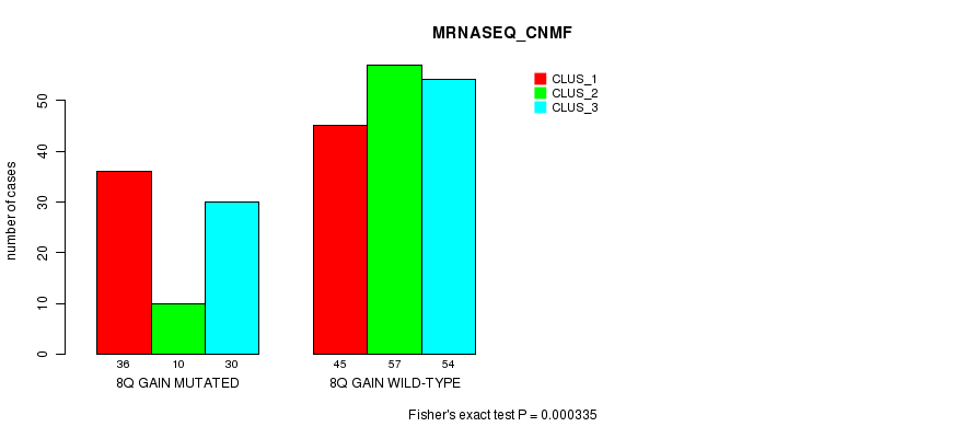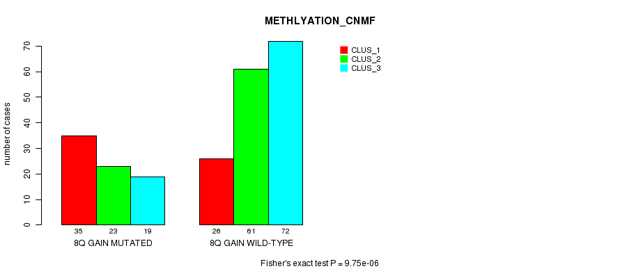 8q gain cnv correlated to 'CN_CNMF', 'METHLYATION_CNMF', and 'MRNASEQ_CNMF'.