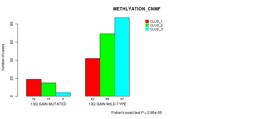 Table S13. Gene #23: '13q gain mutation analysis' versus Clinical Feature #2: 'METHLYATION_CNMF'