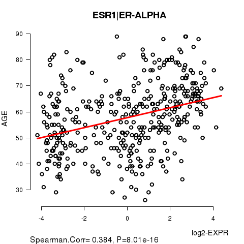 Figure S1. Get High-res Image As an example, this figure shows the association of ESR1|ER-ALPHA to 'AGE'. P value = 8.01e-16 with Spearman correlation analysis. The straight line presents the best linear regression.