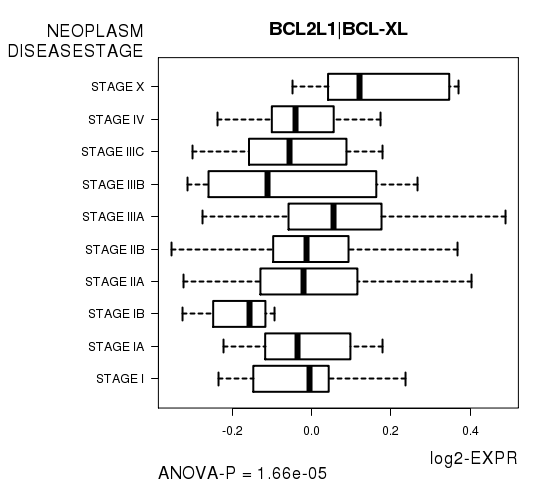 Figure S4. Get High-res Image As an example, this figure shows the association of BCL2L1|BCL-XL to 'NEOPLASM.DISEASESTAGE'. P value = 1.66e-05 with ANOVA analysis.