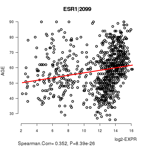 Figure S2. Get High-res Image As an example, this figure shows the association of ESR1|2099 to 'AGE'. P value = 8.39e-26 with Spearman correlation analysis. The straight line presents the best linear regression.