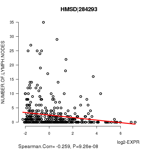 Figure S5. Get High-res Image As an example, this figure shows the association of HMSD|284293 to 'NUMBER.OF.LYMPH.NODES'. P value = 9.26e-08 with Spearman correlation analysis. The straight line presents the best linear regression.