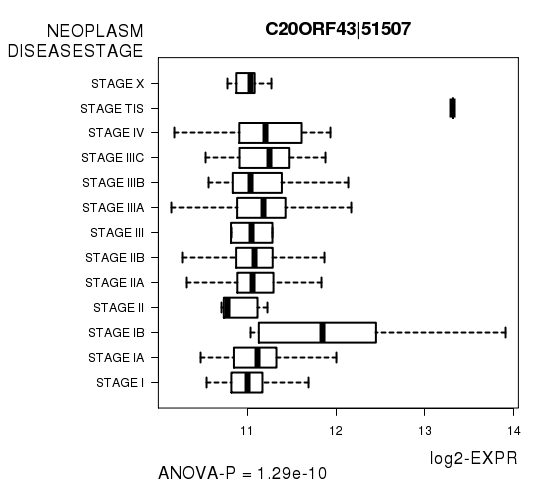Figure S6. Get High-res Image As an example, this figure shows the association of C20ORF43|51507 to 'NEOPLASM.DISEASESTAGE'. P value = 1.29e-10 with ANOVA analysis.