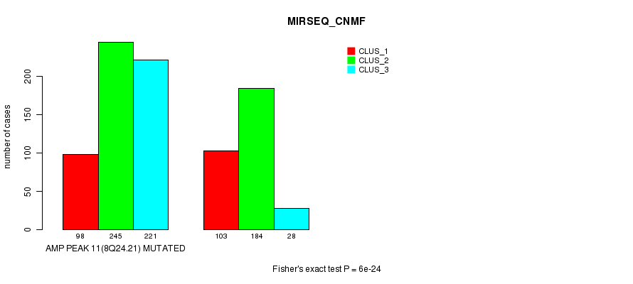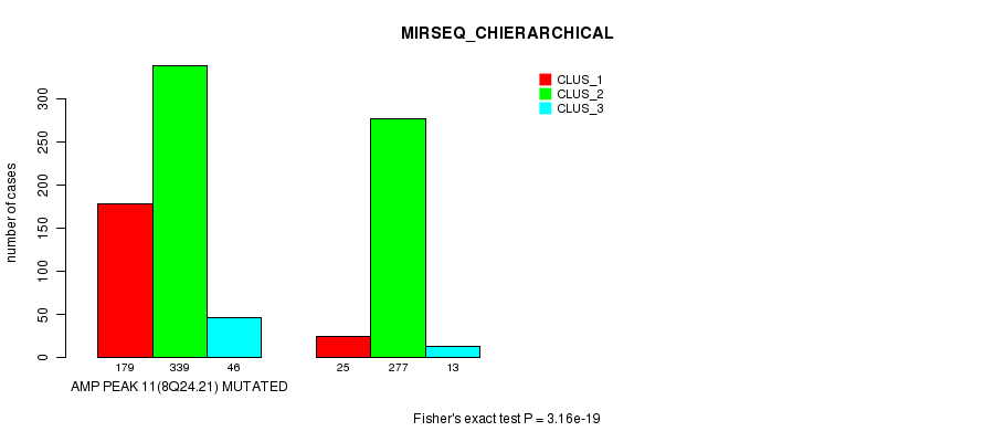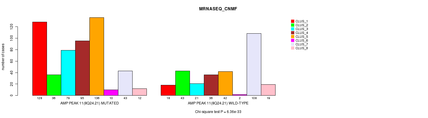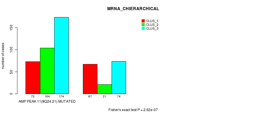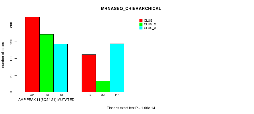 Amp Peak 11(8q24.21) cnvs correlated to 'MRNA_CNMF', 'MRNA_CHIERARCHICAL', 'CN_CNMF', 'METHLYATION_CNMF', 'RPPA_CNMF', 'RPPA_CHIERARCHICAL', 'MRNASEQ_CNMF', 'MRNASEQ_CHIERARCHICAL', 'MIRSEQ_CNMF', and 'MIRSEQ_CHIERARCHICAL'.