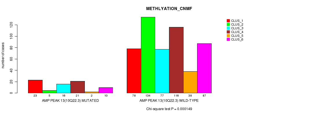Amp Peak 13(10q22.3) cnvs correlated to 'MRNA_CNMF', 'CN_CNMF', 'METHLYATION_CNMF', 'MRNASEQ_CNMF', 'MRNASEQ_CHIERARCHICAL', 'MIRSEQ_CNMF', and 'MIRSEQ_CHIERARCHICAL'.