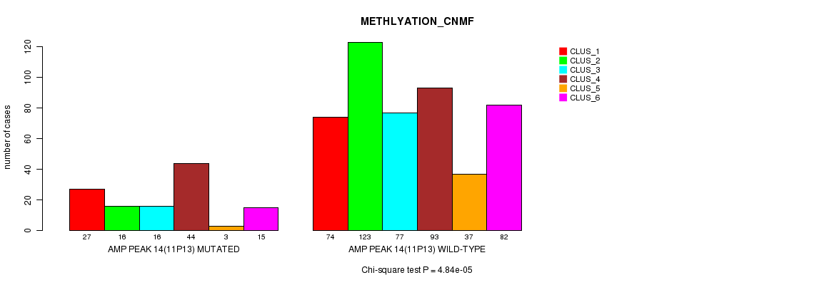 Amp Peak 14(11p13) cnvs correlated to 'CN_CNMF', 'METHLYATION_CNMF', 'MRNASEQ_CNMF', 'MRNASEQ_CHIERARCHICAL', 'MIRSEQ_CNMF', and 'MIRSEQ_CHIERARCHICAL'.