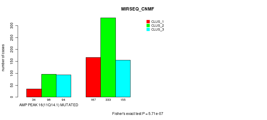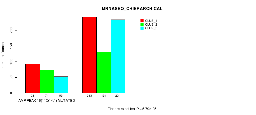 Amp Peak 16(11q14.1) cnvs correlated to 'CN_CNMF', 'METHLYATION_CNMF', 'MRNASEQ_CNMF', 'MRNASEQ_CHIERARCHICAL', 'MIRSEQ_CNMF', and 'MIRSEQ_CHIERARCHICAL'.
